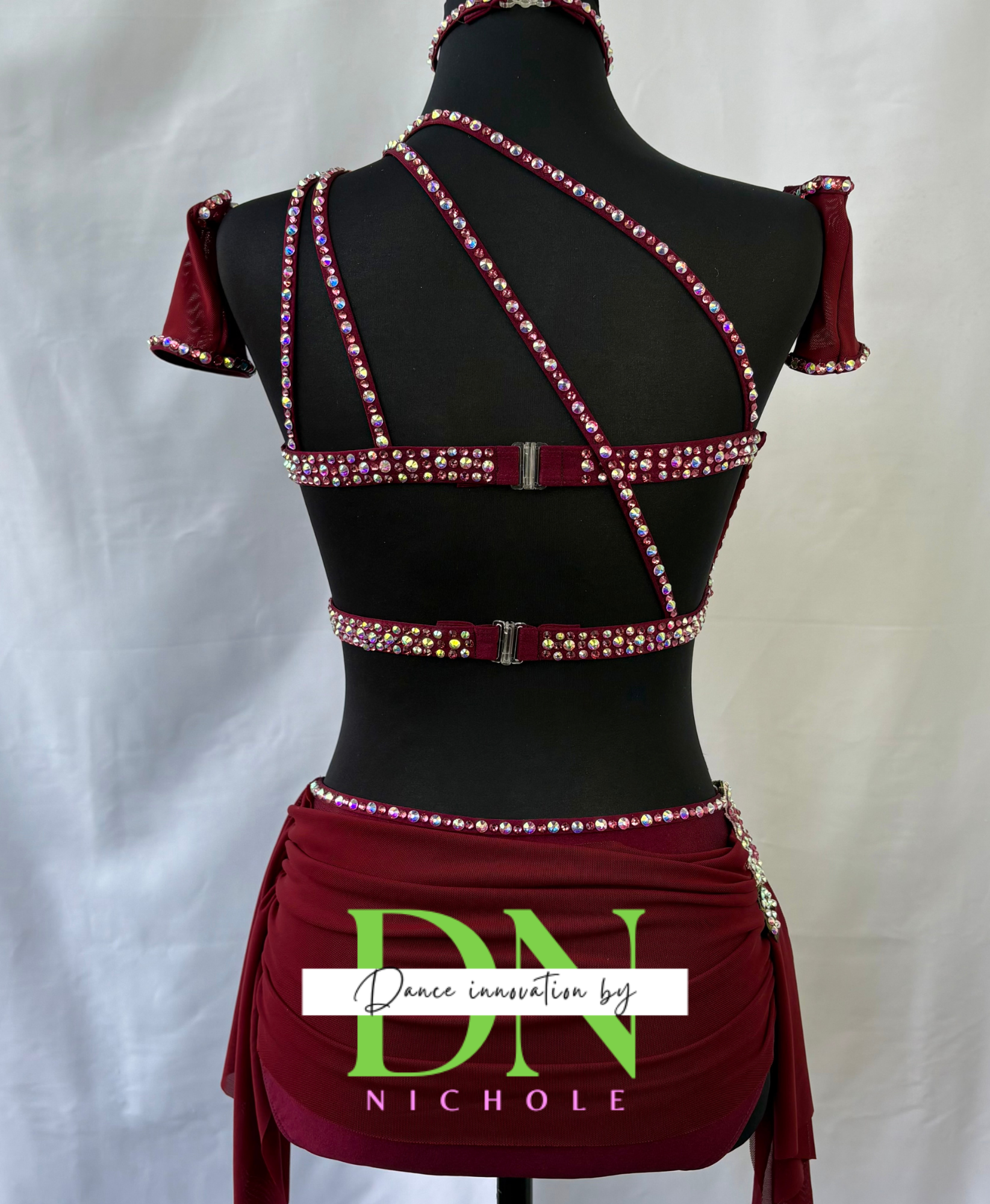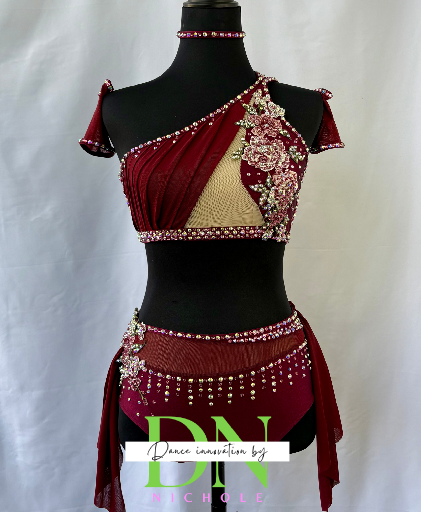 This rich burgundy two-piece costume features an asymmetrical top with illusion mesh detailing and floral appliqués for a romantic yet powerful look. Rhinestone accents trace the neckline, bodice, and waistband, adding luminous sparkle under stage lights. The strappy open-back design and flowing skirt panels complete this dramatic, performance-ready piece. This costume includes a choker and armbands. The rhinestones are high quality.