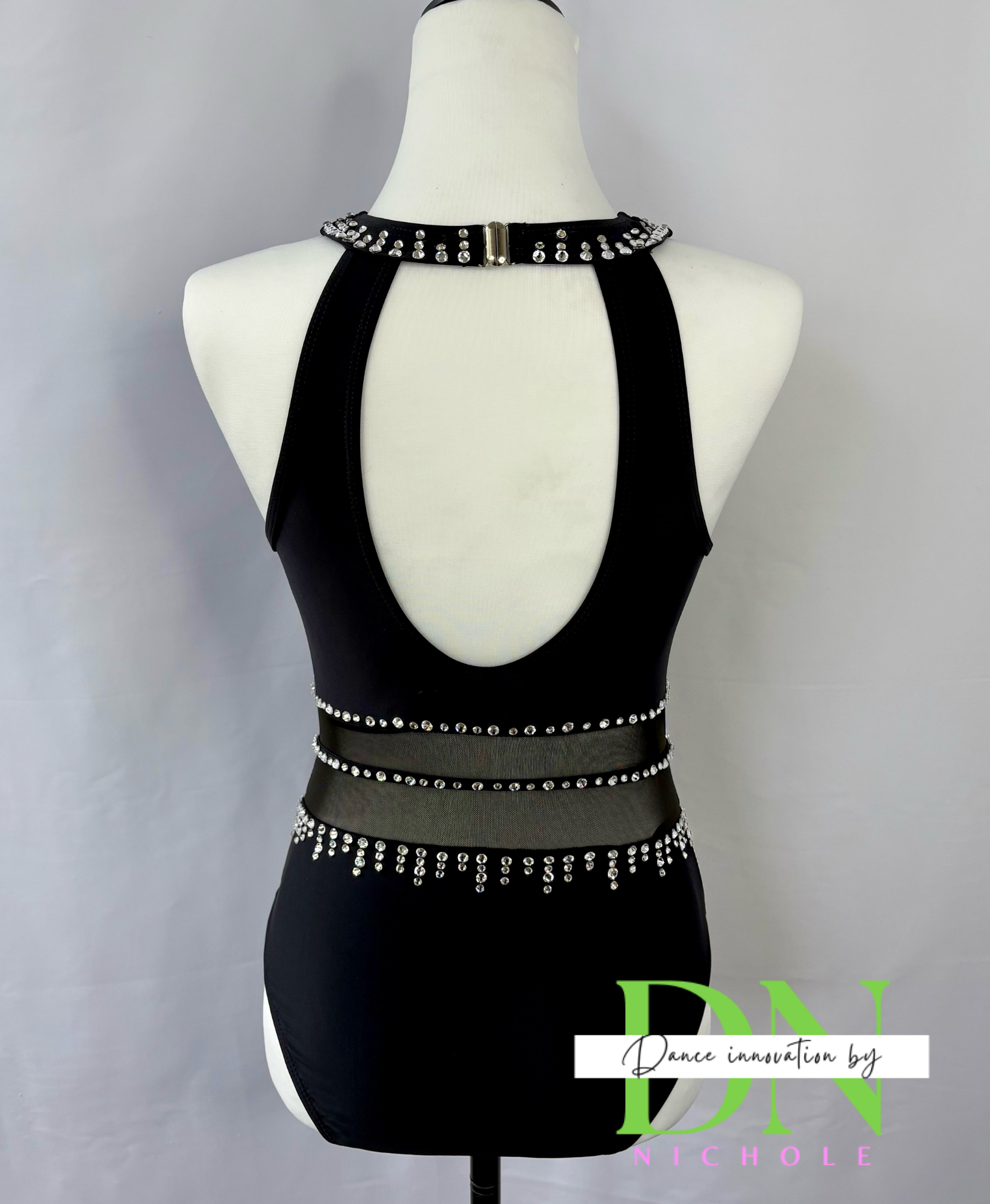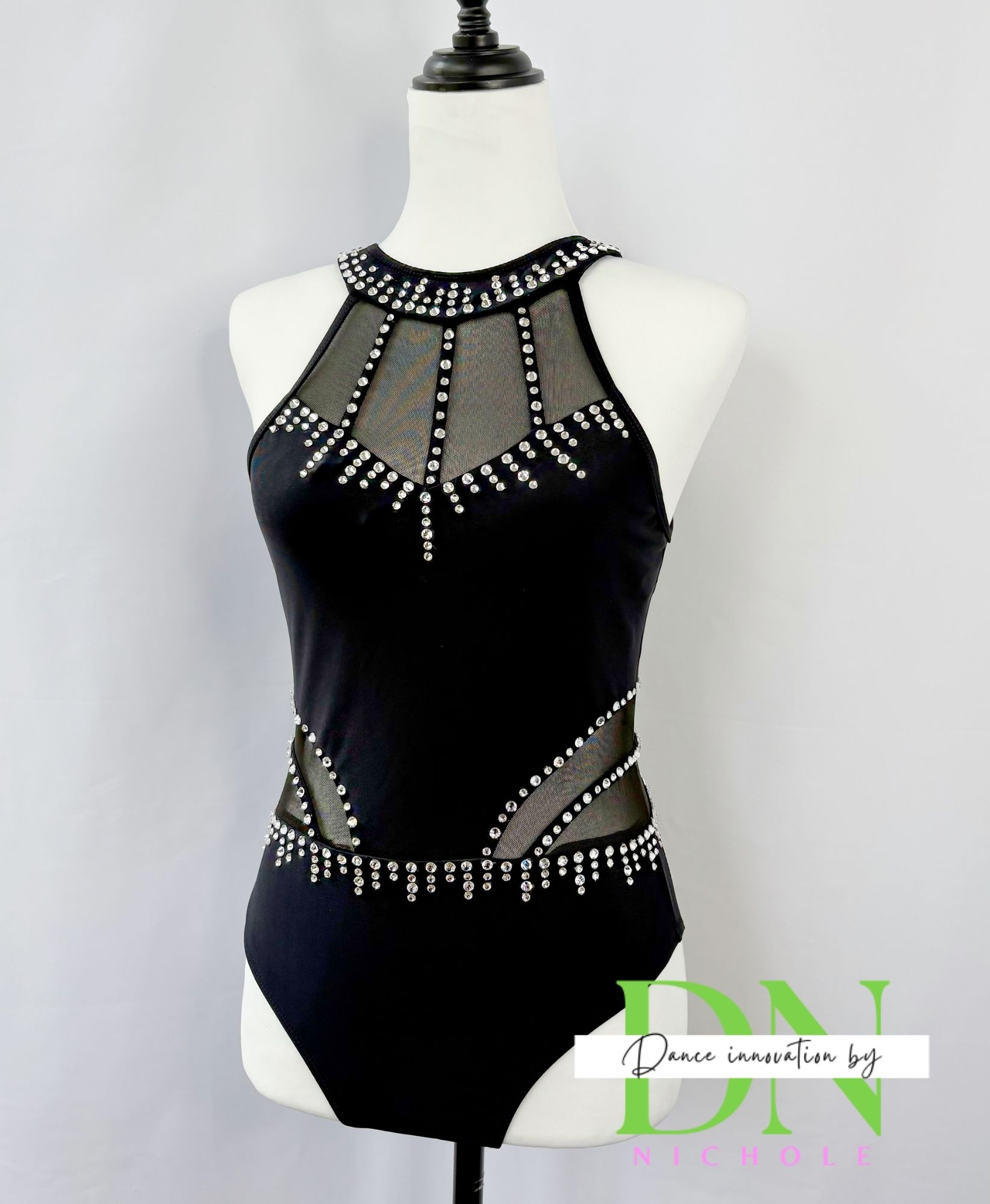 This high cut black leotard brings a bold, edgy look to the stage. Sheer mesh cutouts at the neckline and waist create striking lines, while cascading rhinestone patterns add dramatic sparkle under the lights. The rhinestones are high quality, 15/16 facet stones.