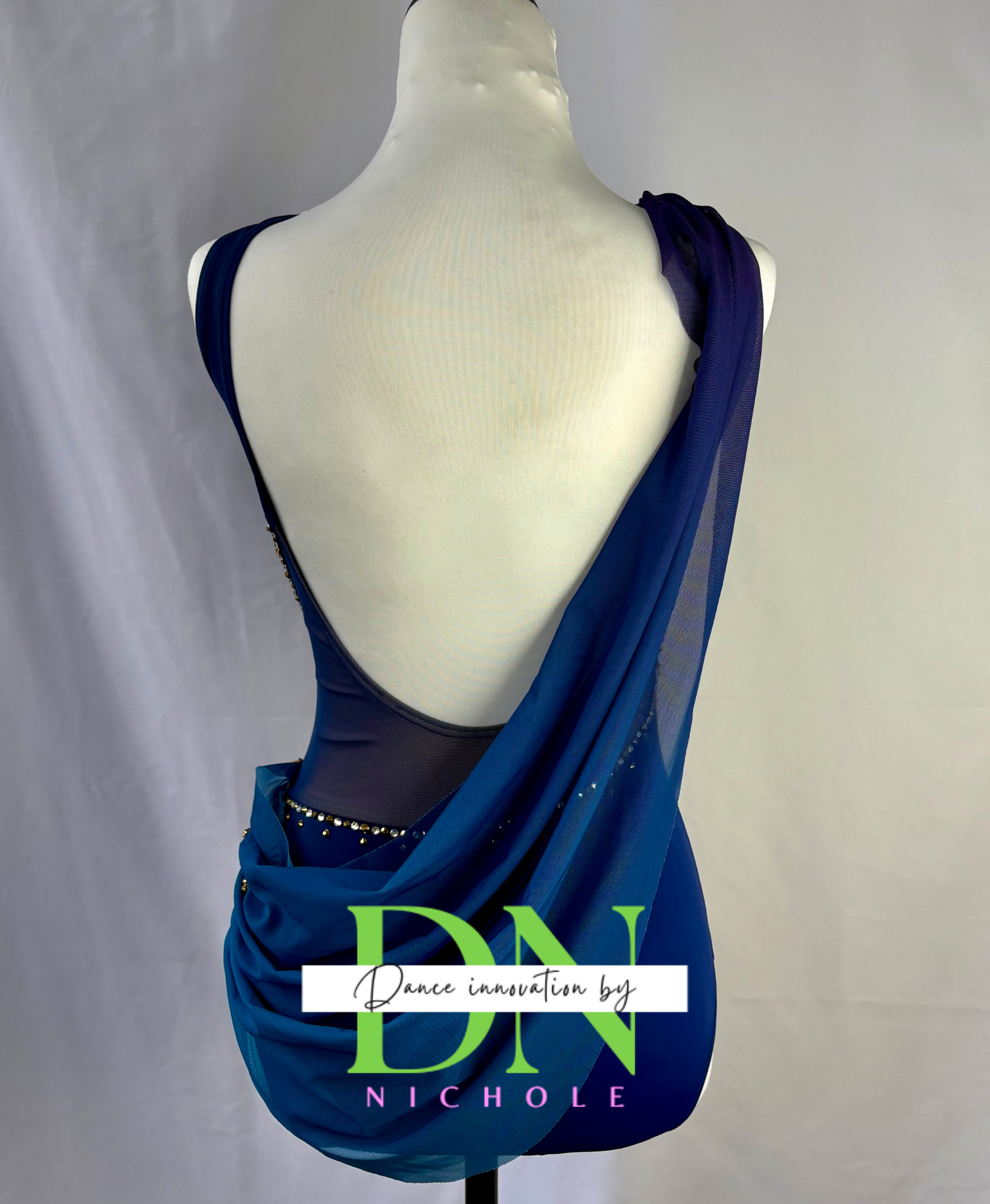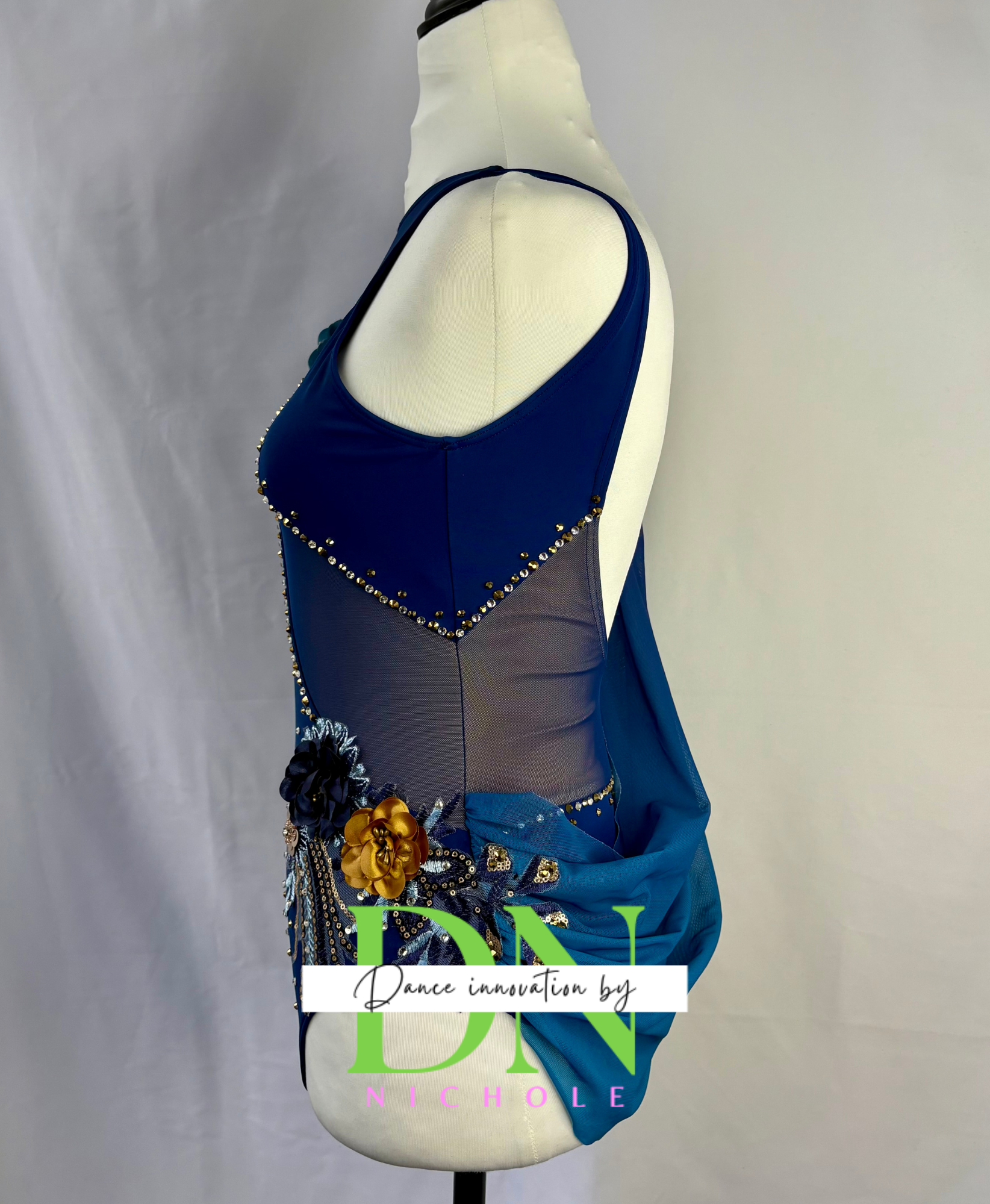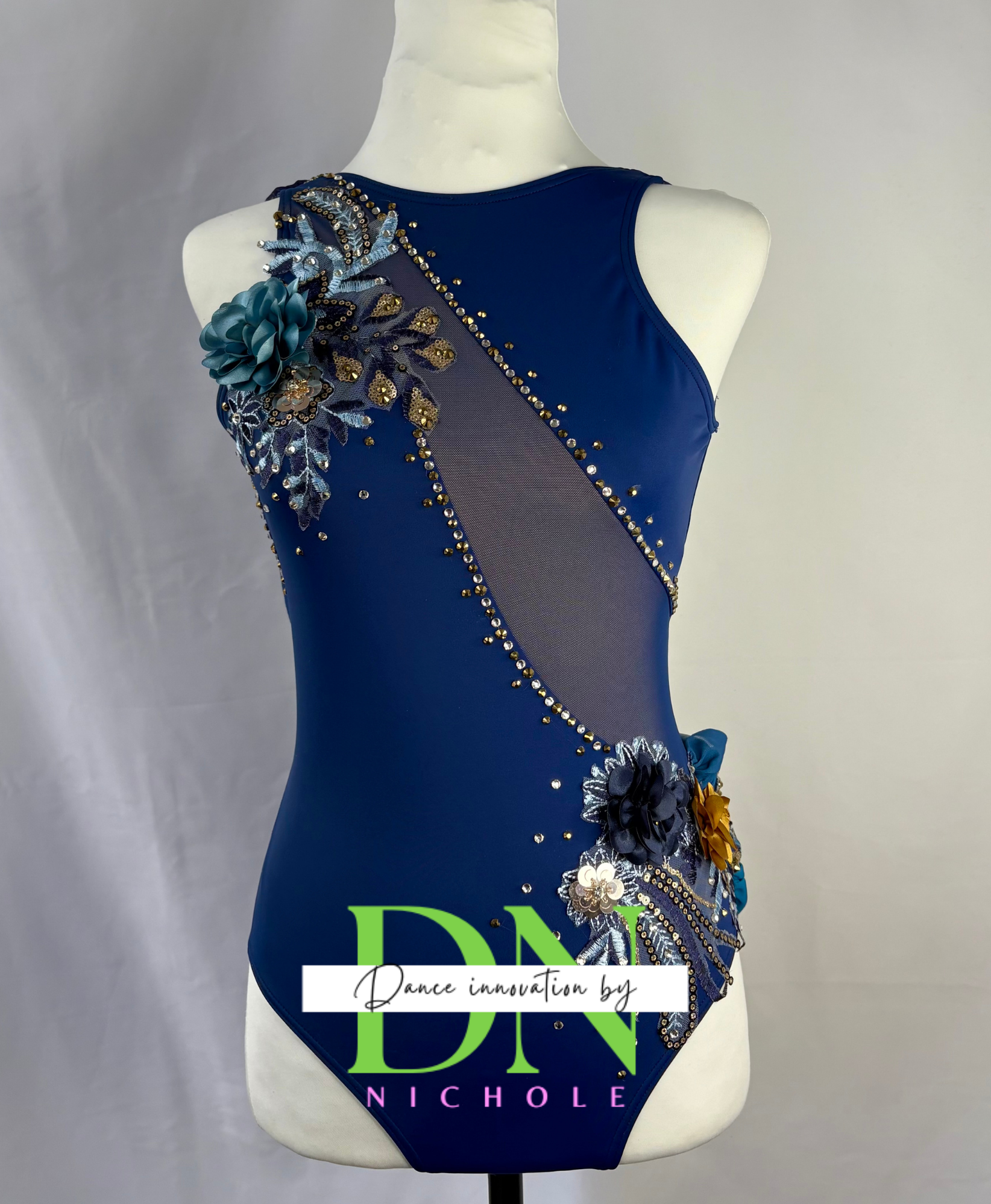 This elegant deep sapphire leotard features a sleek sleeveless silhouette highlighted by a soft diagonal mesh inset that creates beautiful contrast and elongates the line of the body. Intricate floral appliqués in shades of blue and gold cascade across the shoulder and hip, accented with shimmering rhinestones and metallic studs for radiant stage sparkle. Dimensional fabric flowers add rich texture and visual interest, while scattered crystals throughout the bodice catch the light with every movement. The high-quality rhinestones and detailed embellishments make this costume a sophisticated, show-stopping performance piece.