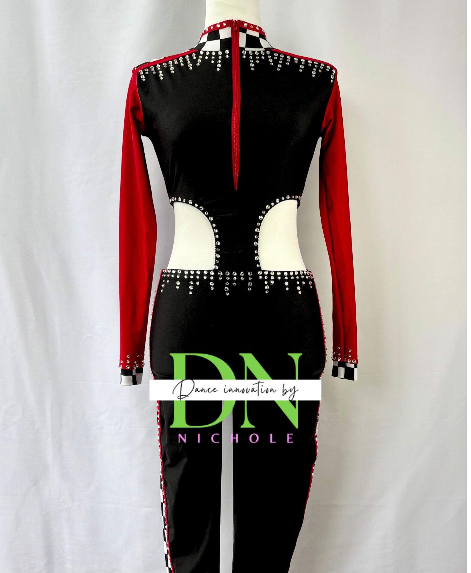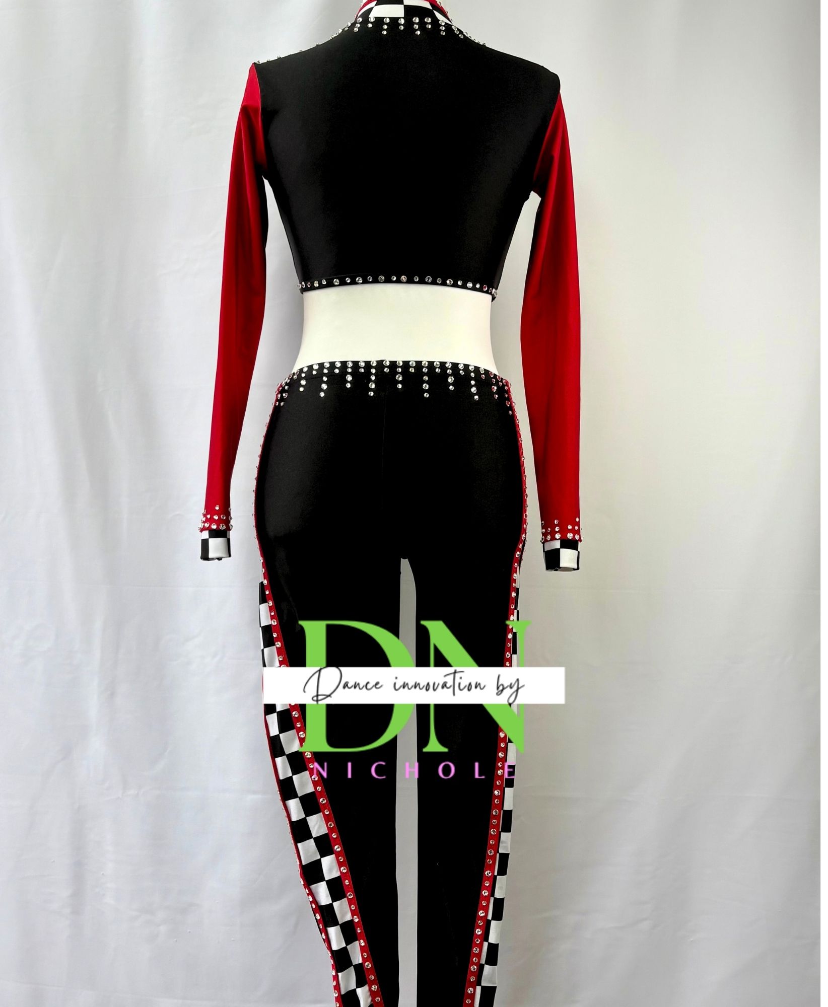 This sleek black unitard is the ultimate statement piece for a racecar themed routine. The dynamic design features rhinestone detailing that mimics the energy of speed and motion, while the fitted silhouette delivers a powerful, athletic look. With its bold lines and high-performance edge, this costume brings confidence and intensity to the stage. The rhinestones are high quality stones.