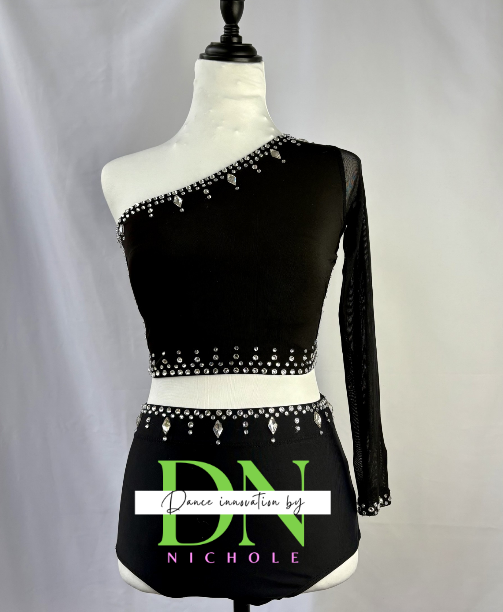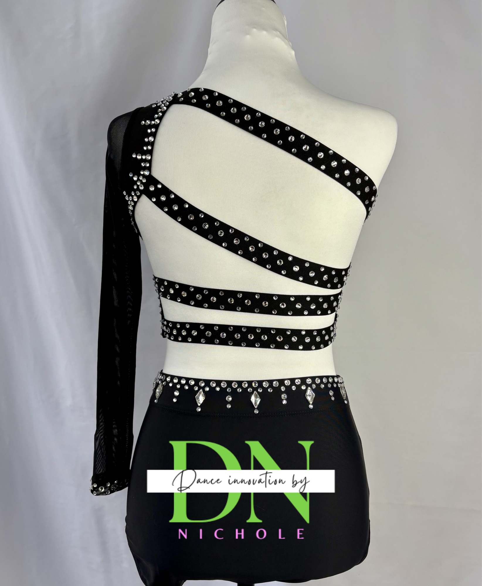 This sleek black two-piece costume features a bold one-shoulder design with a sheer mesh sleeve for a striking, modern silhouette. Rhinestone accents trim the neckline, straps, and waistband, while sparkling crystal details add eye-catching shine under stage lights. The open strappy back enhances the edgy, performance-ready look. The rhinestones are high quality.