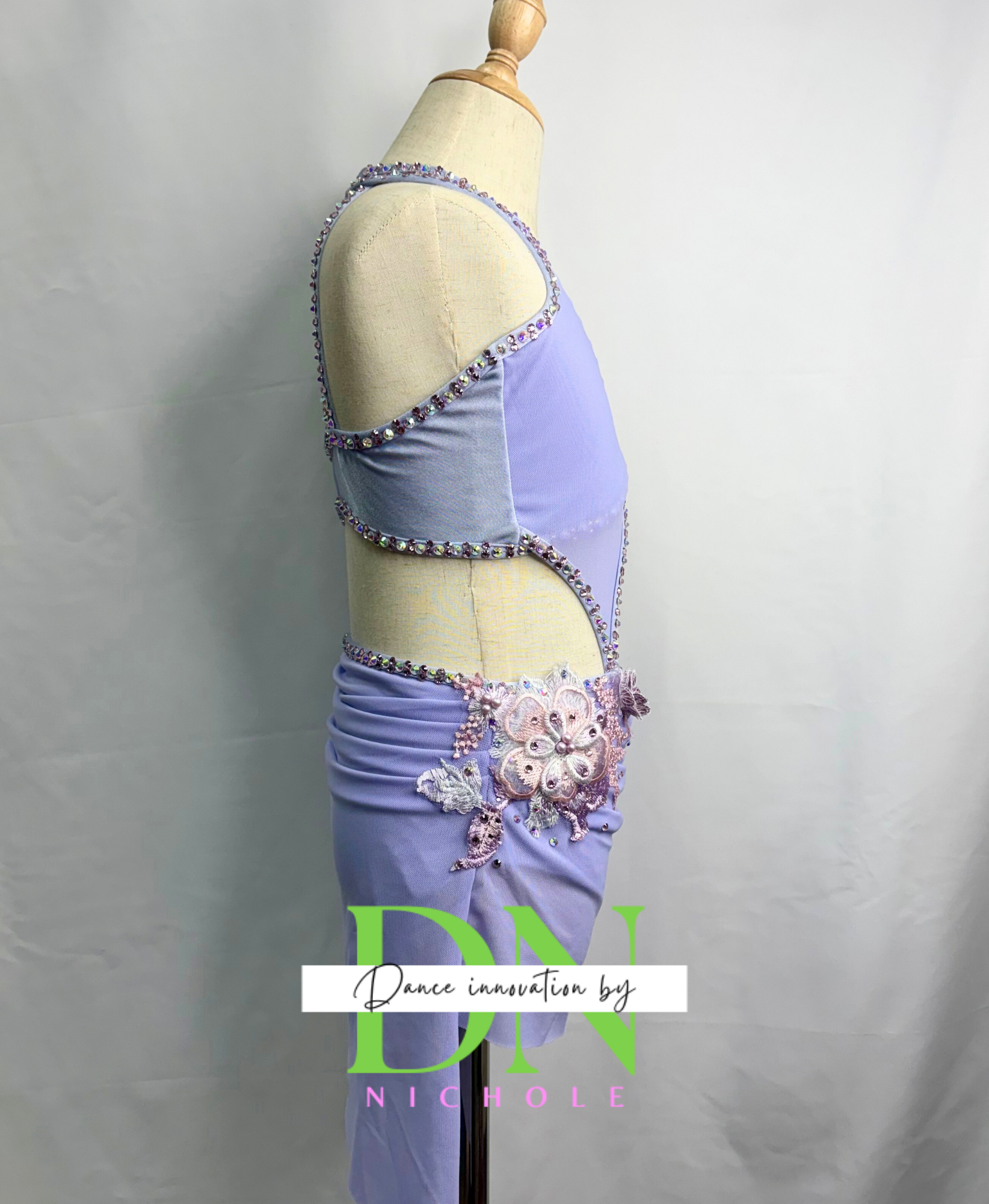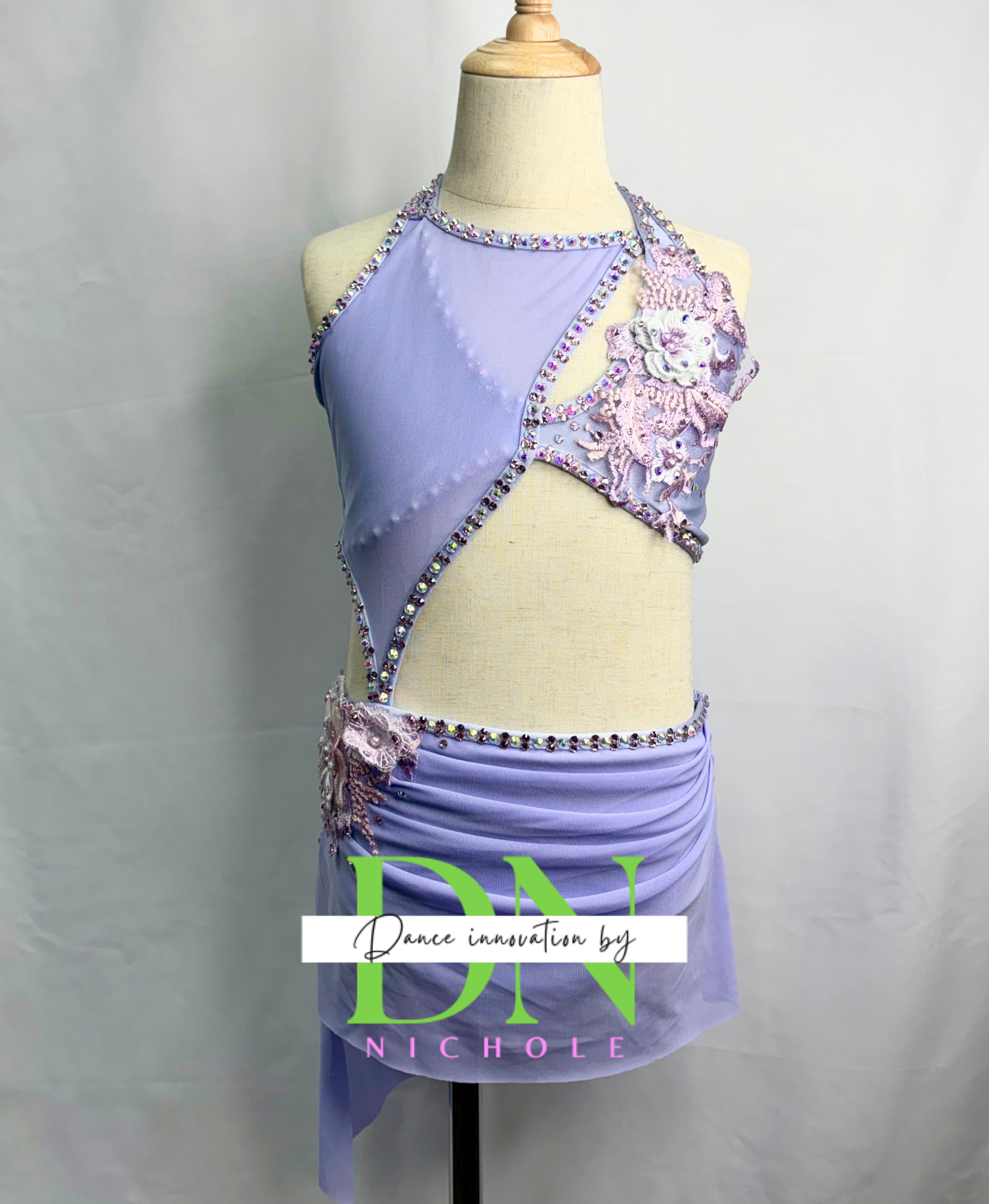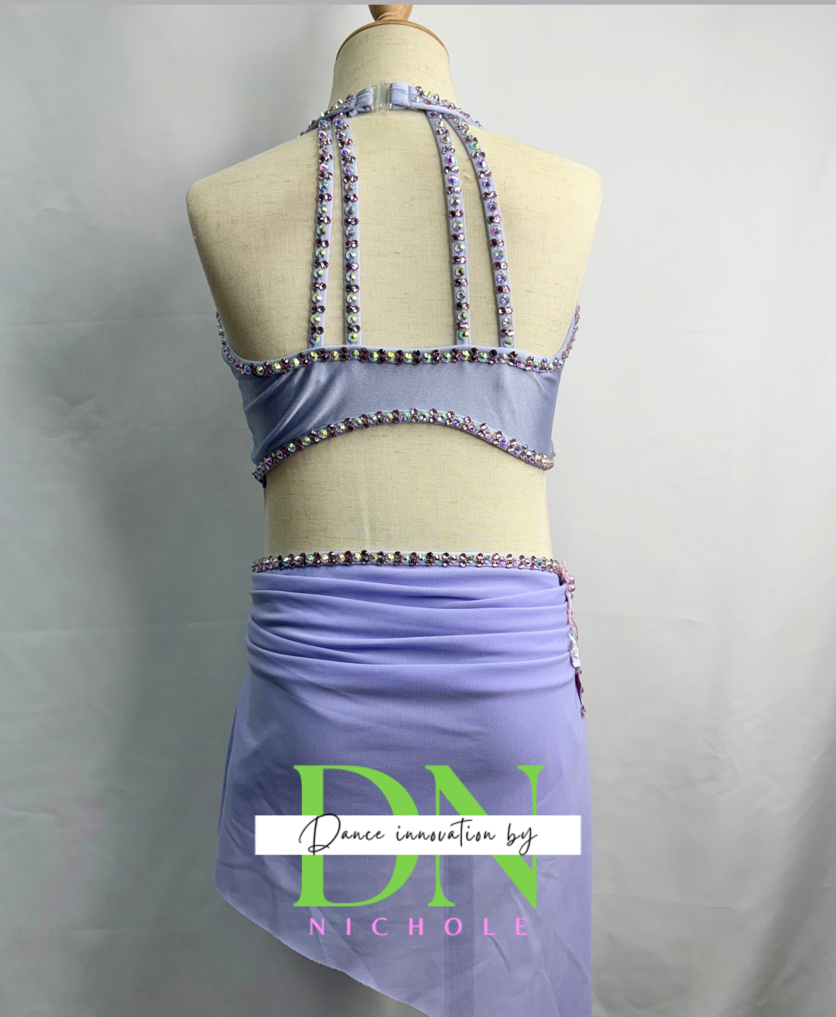 This soft lavender two-piece costume features a graceful asymmetrical halter-style top with delicate mesh paneling and elegant cutout detailing across the bodice. Sparkling rhinestones outline the neckline and seams, catching the stage lights and adding a beautiful shimmer. Intricate floral appliqués with subtle beadwork accent the shoulder and hip, creating a romantic, dimensional look. The coordinating skirted brief includes a softly draped overlay with rhinestone trim, while the crisscross back straps complete the design with a secure and eye-catching finish. The high-quality rhinestones add the perfect touch of sparkle for a stunning stage presence.